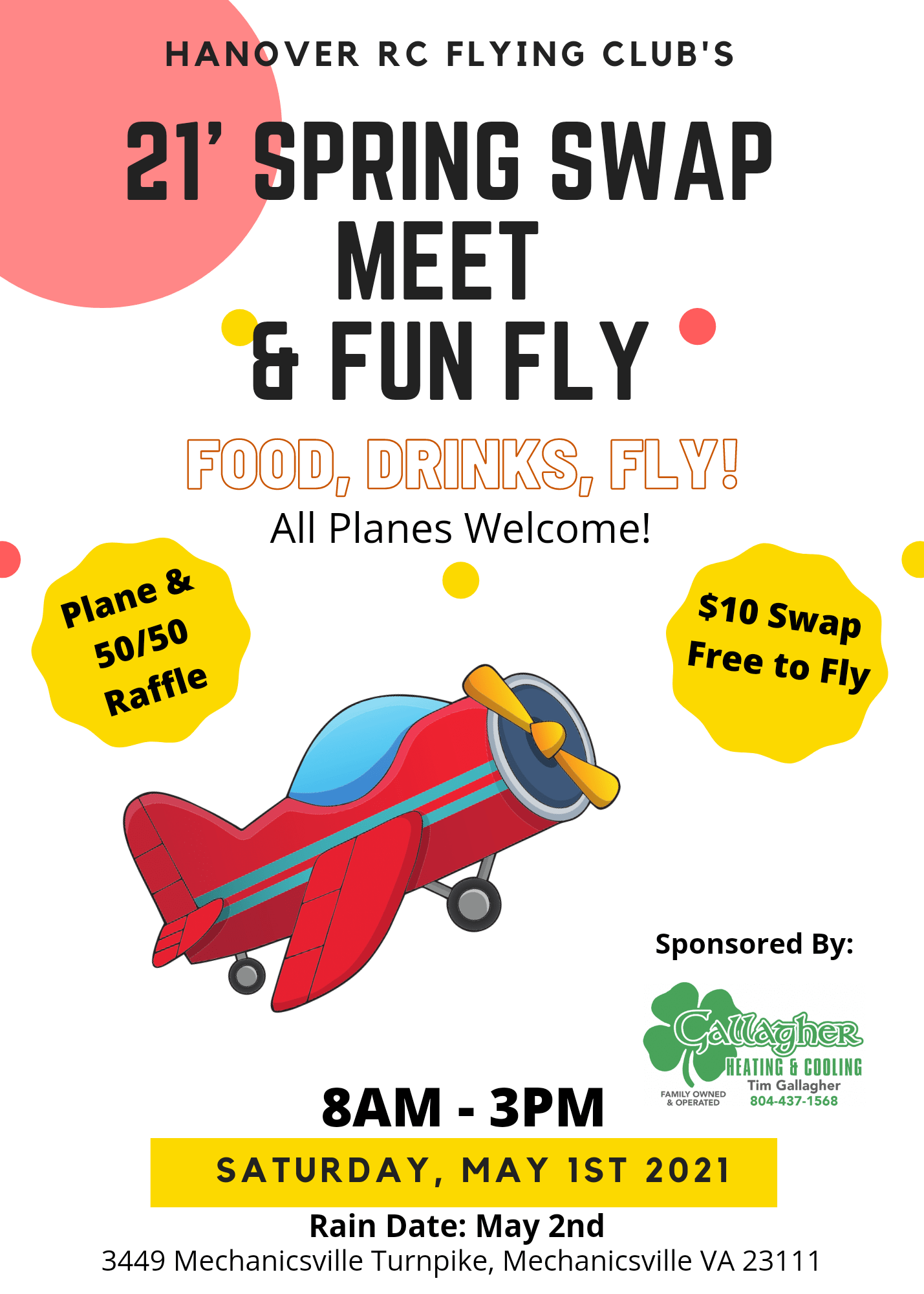 Swap meet and fun fly May 1st from 8am – 3pm at the Hanover RC Flying Club located in Mechanicsville Va. 3449 Mechanicsville Turnpike Mechanicsville VA 23111